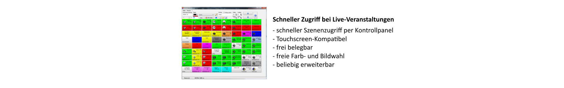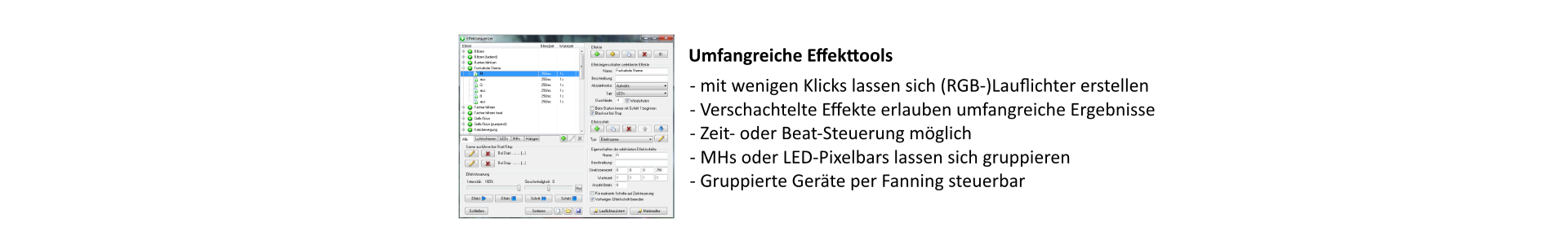 - Vielfältigste Steuerungsmöglichkeiten (MIDI, DMX512, Netzwerk, etc.), Lauflichteditoren, Partymodul und vieles mehr