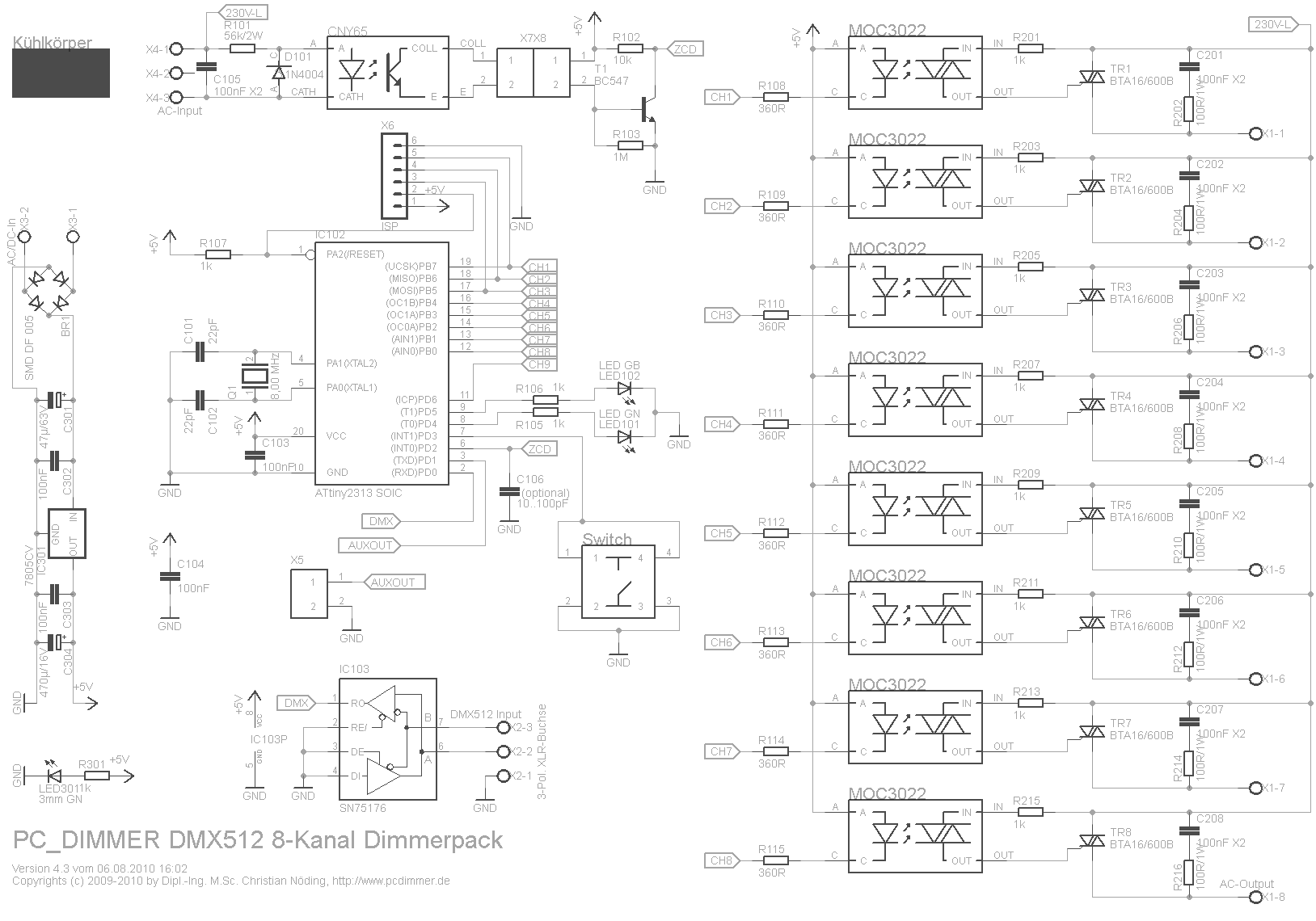 Die Schaltung fällt recht kompakt aus, da ein großteil der Technik in der Firmware des Mikrocontrollers steckt. Man benötigt lediglich den Atmel in seiner Grundbeschaltung und ein paar zusätzliche Komponenten: die Spannungsversorgung (Links) versorgt die Schaltung mit der notwendigen Energie. Die Netzsynchronisation (Oben) hält die Schaltung immer Synchron zum 50Hz-Versorgungsnetz, während der DMX512-Empfänder (Unten) die Steuersignale des Computers empfängt. Der Mikrocontroller (Mitte) steuert schließlich die 8-Ausgänge an, die die TRIAC-Schaltungen (Rechts) bei 230V Anwendung, oder ggfs. Operationsverstärker für 0-10V Anwendung ansteuert. Ein Beispiel für 0-10V Erzeugung findet sich etwas weiter unten in diesem Bericht.