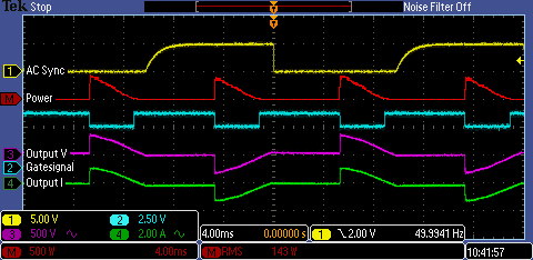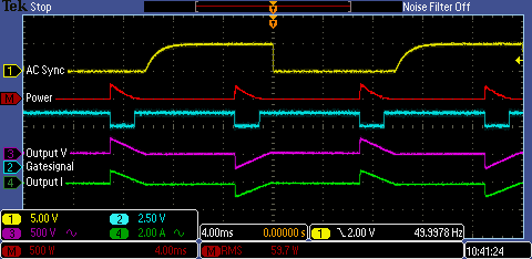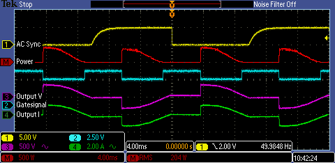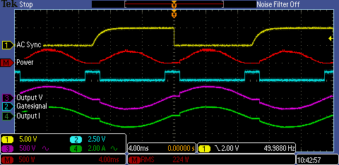 Gelb zeigt das Synchronisationssignal, was für die Netzsynchronisation benötigt wird. Rot ist die errechnete Leistung aus Spannung und Strom an der Last, Blau ist das Gatesignal zur Ansteuerung der TRIACs und Violett/Grün sind Lastspannung und -strom.