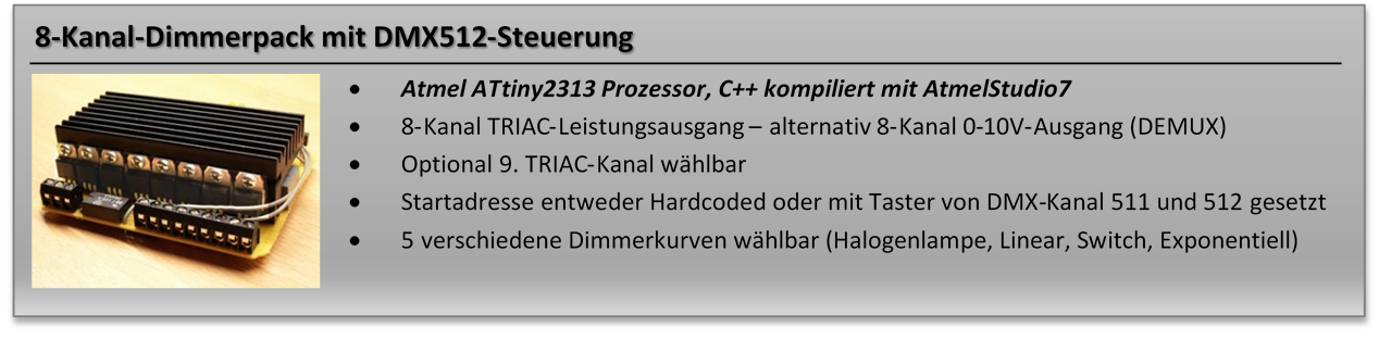 - DMX512-Analogdimmerpack zur Erzeugung von 0-10V Spannungen über PWM-Glättung (Tiefpassfilter + OPV)