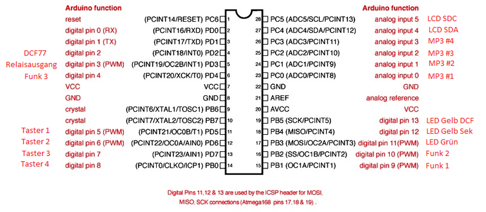 Version 2 des Systems nutzt einen Arduino Uno R3. Nachfolgend kann man die Belegung der einzelnen Pins finden. Alle weiteren Informationen kann man dann wieder oben im Schaltplan von Version 1 nachschauen.