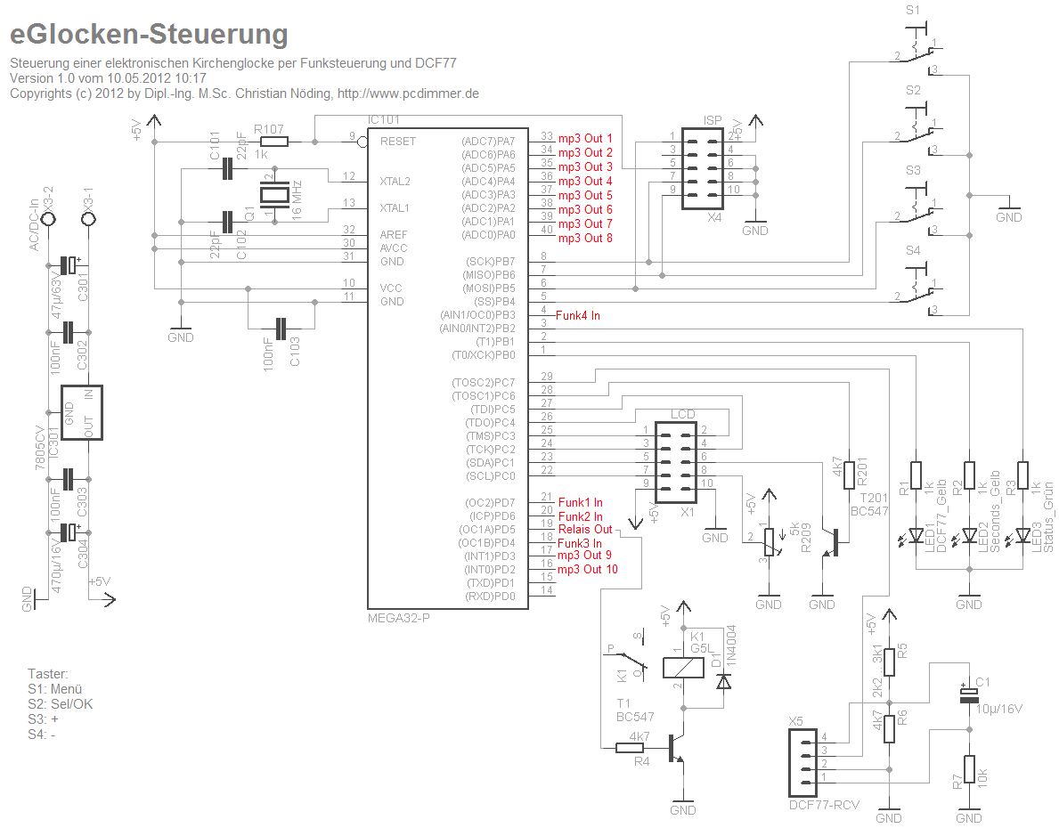 Der nachfolgend gezeigte Schaltplan ist noch für Version 1 mit einem ATmega32 gedacht und soll lediglich verdeutlichen, was technisch in diesem System passiert. Die Version 2 mit Arduino wird einfach fliegend mit einzelnen Drähten entsprechend verbunden. Die als „mp3 Out“ bezeichneten Signale werden über einen passenden Basiswiderstand auf einzelne Transistorstufen verbunden, damit man das MSM4-Modul vernünftig ansteuern kann (Taster werden simuliert und Pins über die Transistoren auf GND geschaltet). Es können bis zu 6 einzelne Steuer-Leitungen vom Mikrocontroller zum mp3-Modul gelegt, um die einzelnen mp3-Dateien starten und stoppen zu können (siehe weiter unten). Zusätzlich wird der Steuerausgang des Mikrocontrollers für den Relais-Transistor auch an das mp3-Modul gelegt, da dieses über einen Einschalteingang verfügt, sodass man das mp3-Modul zu 95% der Zeit komplett ausgeschaltet lassen und nur während des Läutens vom Mikrocontroller aus einschalten kann.