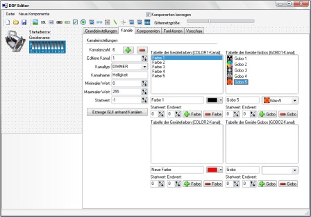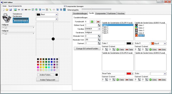 Das folgende Bild zeigt den DDF-Editor mit insgesamt 6 definierten Kanälen. Zudem sind 5 Farben und 5 Gobos definiert: