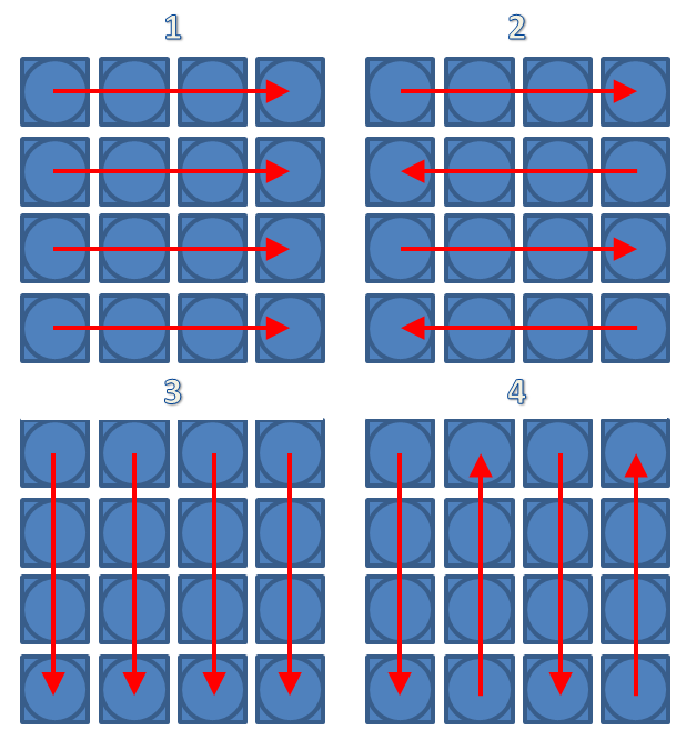 - Spalten-Pendeln: Ungerade Spalten von oben nach unten, gerade Spalten von unten nach oben
