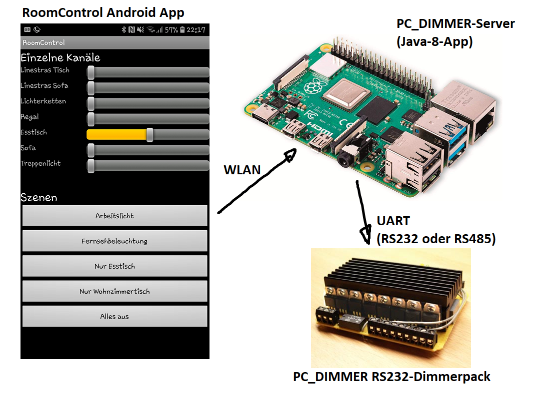 Mit der hier vorgestellten Steuerung kann man mit einem RaspberryPi und dem PC_DIMMER RS232-Dimmerpack oder der RS232-RGBW-LED-Steuerung ohne weiteres Zubehör mittels Handy das Licht dimmen. Da sowohl das RS232-Dimmerpack als auch die RS232-RGBW-LED-Steuerung einen eigenen Dimmerkernel besitzt, kann man Ein- und Ausblendungen (also Szenensteuerungen mit sanften Übergängen) direkt ohne weiteres Zutun mit einem einzelnen Befehl ausführen. Zudem lässt sich der PC_DIMMER_Server auch in die Heim-Automatisierungssoftware FHEM integrieren (siehe Artikel PC_DIMMER meets FHEM).