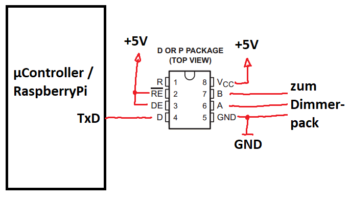 TIPP: Als Hardware kann man 1:1 die Platinen des DMX512-Dimmerpacks verwenden, welches ebenfalls einen ATtiny2313 verwendet, wodurch man sehr flexibel die gleiche Hardware zwischen RS232 und DMX512 per Firmwareupdate umschalten kann. Möchte man den 8MHz Quarz verwenden, liegt die maximale Baudrate allerdings bei 38,4kBaud. Da das DMX512-Dimmerpack mit einem SN75176-RS485-Transmitter ausgestattet ist, muss man an den RS232-Anschluss ebenfalls einen SN75176-Chip anschließen (siehe Grafik)